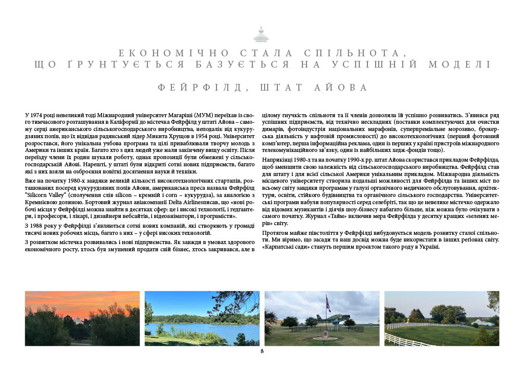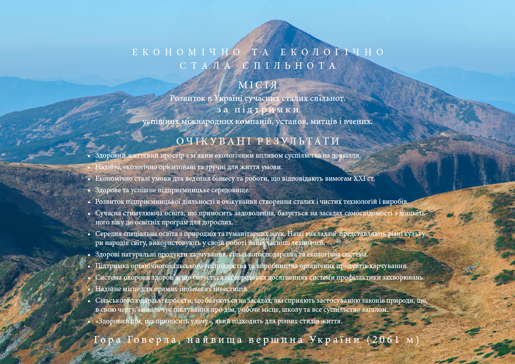Економічно та екологічно стала спільнота Місія: Розвиток в Україні сучасних сталих спільнот. за підтримки успішних міжнародних компаній, установ, митців і вчених.